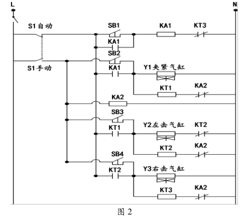 线圈得电吸合,左击打气缸动作,同时 KT2 时间继电器开始计时,计时到达预设后,电磁阀Y2 线圈失电,左击打气缸复位,同时电磁阀 Y3 线圈得电吸合,KT3